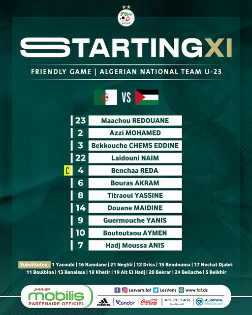 كشف مدرب المنتخب الوطني لأقل من 23 عاما نورالدين ولد علي على التشكيلة الأساسية. التي سيعتمد عليها خلال مباراة اليوم الودية أمام منتخب فلسطين.