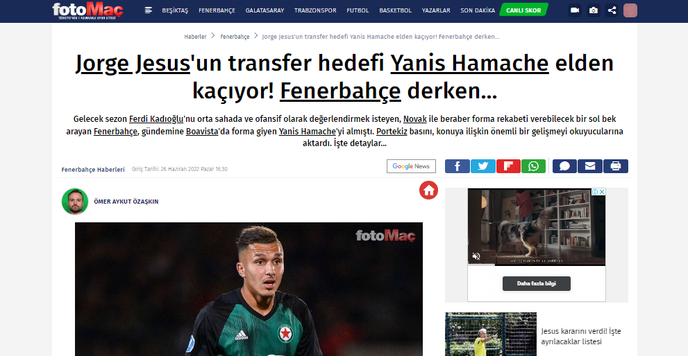 وكشف موقع “فوتوماك” التركي، يوم الأحد، عن دخول الدولي الجزائري حماش، دائرة اهتمامات مدرب فنربخشة التركي، خورخي خوسيس.