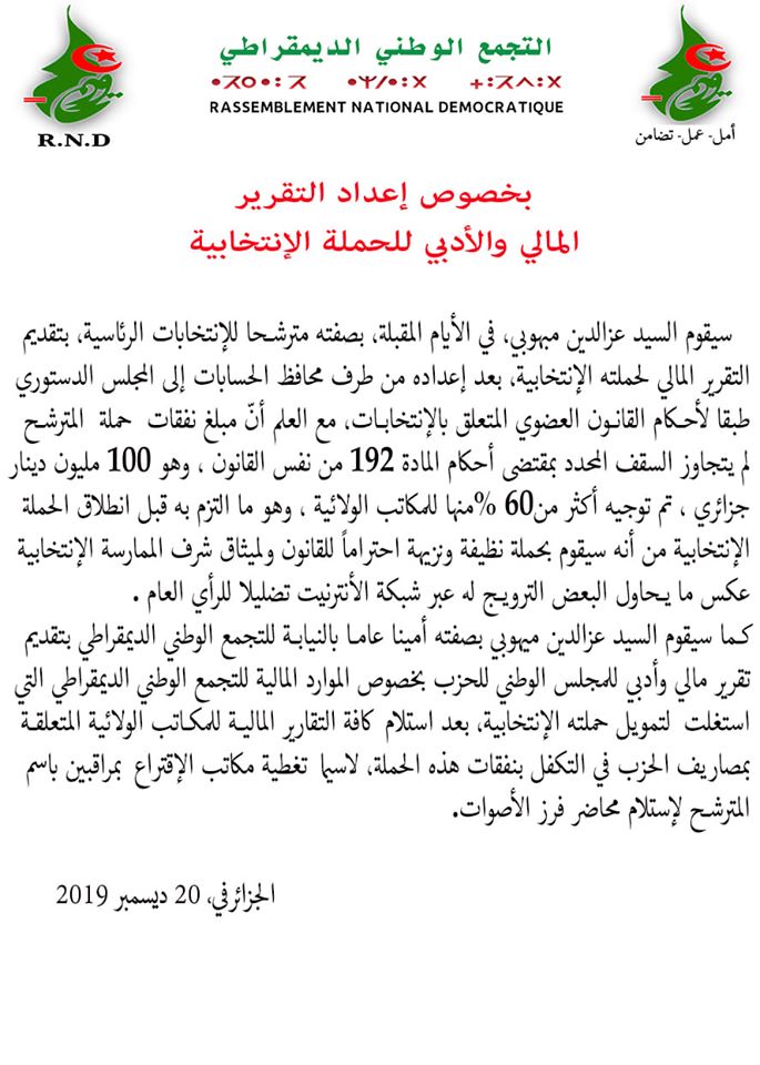 وكشف بيان الأرندي ان مرشحه للرئاسيات عزالدين ميهوبي صرف 10 ملايير سنتيم، تم توجیه 60 بالمئة منھا إلى المكاتب الولائیة.