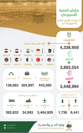 وأصدرت السلطات السعودية بمختلف قنصلياتها عبر العالم، أكثر من 4 ملايين و338 ألف تأشيرة، بزيادة 222 ألف تأشيرة في أسبوع.