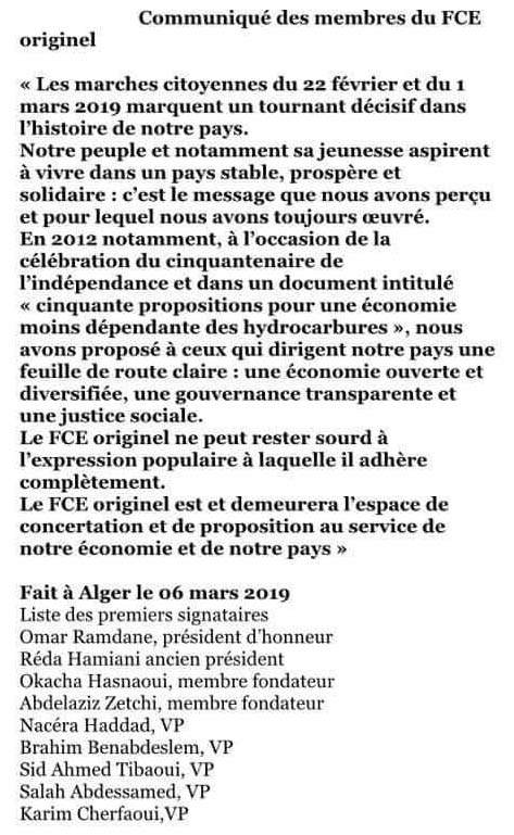 أعلن اليوم الأربعاء 11 عضو من المؤسسين لمنتدى رؤساء المؤسسات وقوفهم مع الحراك الشعبي المناهضة لعهدة رئاسية جديدة في مختلف ولايات الوطن.