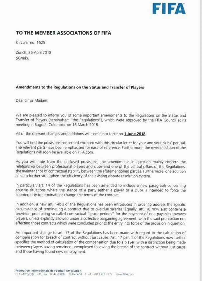 للتذكير فإن الفيفا تسمح لأي لاعب بفسخ عقده مع ناديه، في حال عدم تلقيه راتبه لمدة شهرين كاملين .