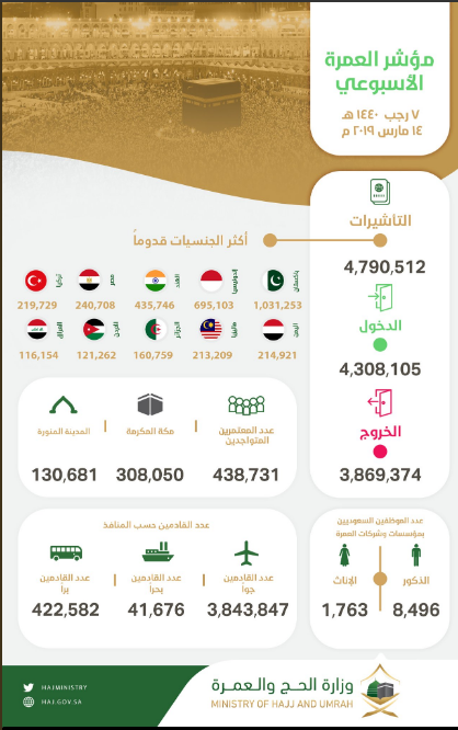وتجاوز عدد المعتمرين الإجمالي على المستوى العالمي 4 ملايين و790 ألف شخص في ظرف 6 أشهر، في انتظار شهر رمضان.