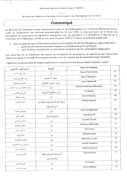 الأ 179 رسالة رغبة في الترشح تتمثل في 14 رسالة لرؤساء أحزاب سياسية و 165 رسالة لمترشحين أحرار.