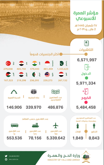 من تأشيرات العمرة لأداء المناسك، وذلك من أصل 6 مليون و571 ألف و997 تأشيرة تم إصدارها عبر مختلف بلدان العالم.