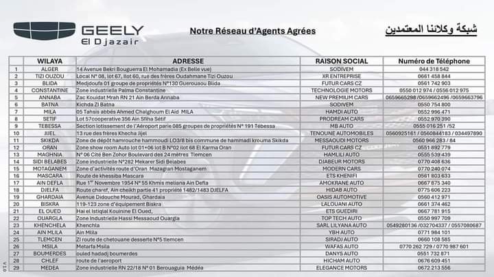 وحسب الموقع الرسمي لعلامة “جيلي الجزائر”، ضمّت اللائحة الرسمية 29 وكيلا رسميا معتمدًا موزعا عبر 29 ولاية.