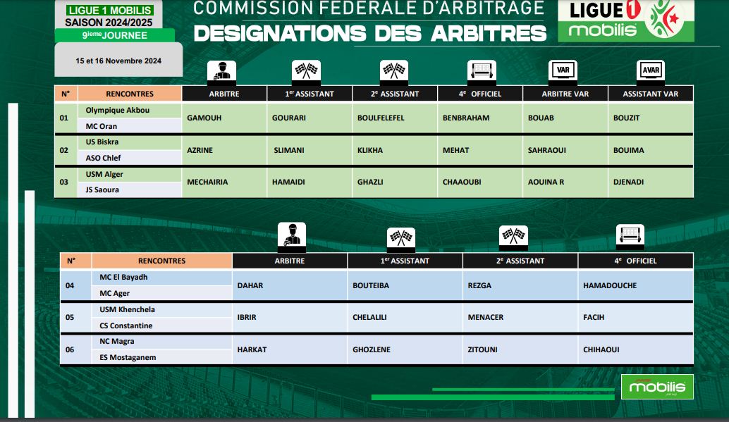 في حين تم تعيين الحكم مشايرية، بمساعدة كل من حمايدي وغزلي. لإدارة لقاء اتحاد العاصمة والضيف شبيبة الساورة، إلى جانب حكم “الفار” عوينة رفيق، بمساعدة جنادي.