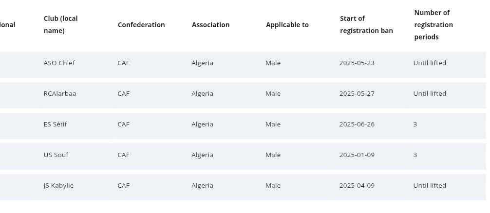 وتضمنت القائمة 5 أندية جزائرية، تم تجميد قدرتها على تسجيل لاعبين جدد حتى تسوية وضعياتها.