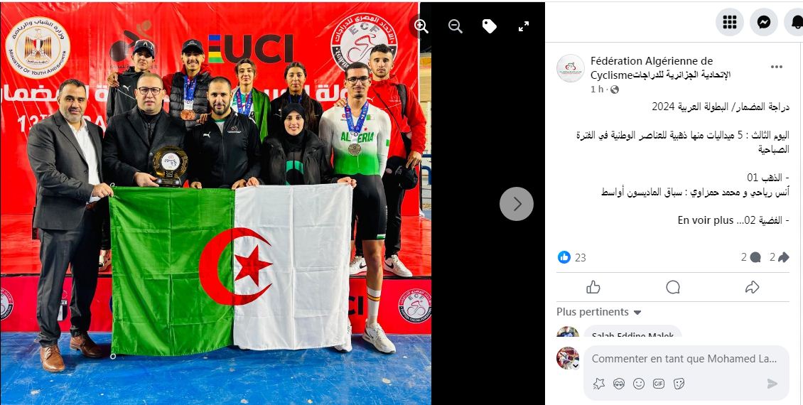 عزز المنتخب الوطني الجزائري للدراجات، رصيده بـ 5 ميداليات متنوعة، في ثالث أيام البطولة العربية الجارية بالقاهرة المصرية، ما بين الـ 25 والـ 28 من ديسمبر الجاري.