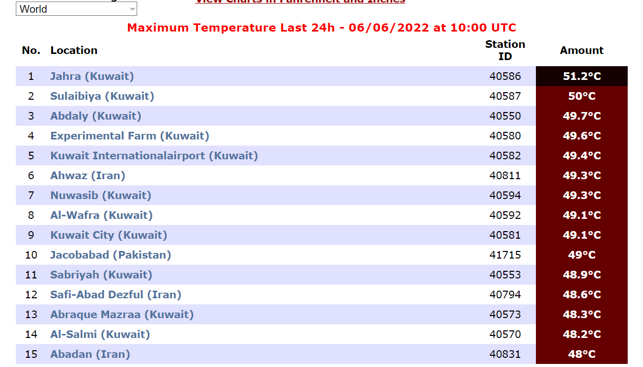 وحسب ذات الموقع، فقد سجلت الكويت أعلى 5 درجات حرارة بالعالم، في عدة مدن.
