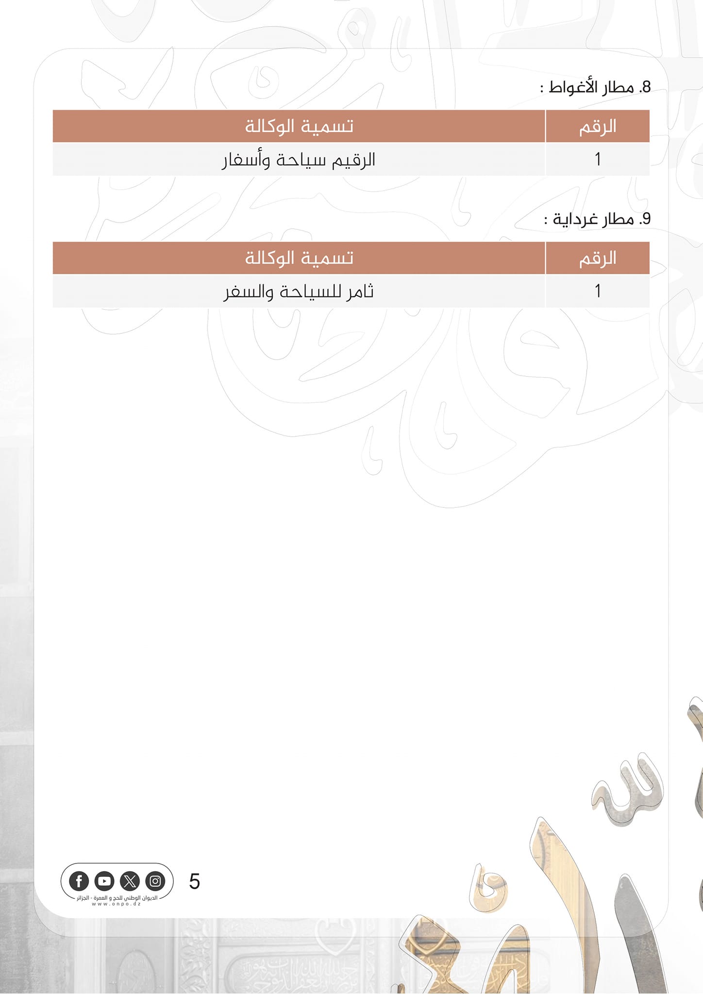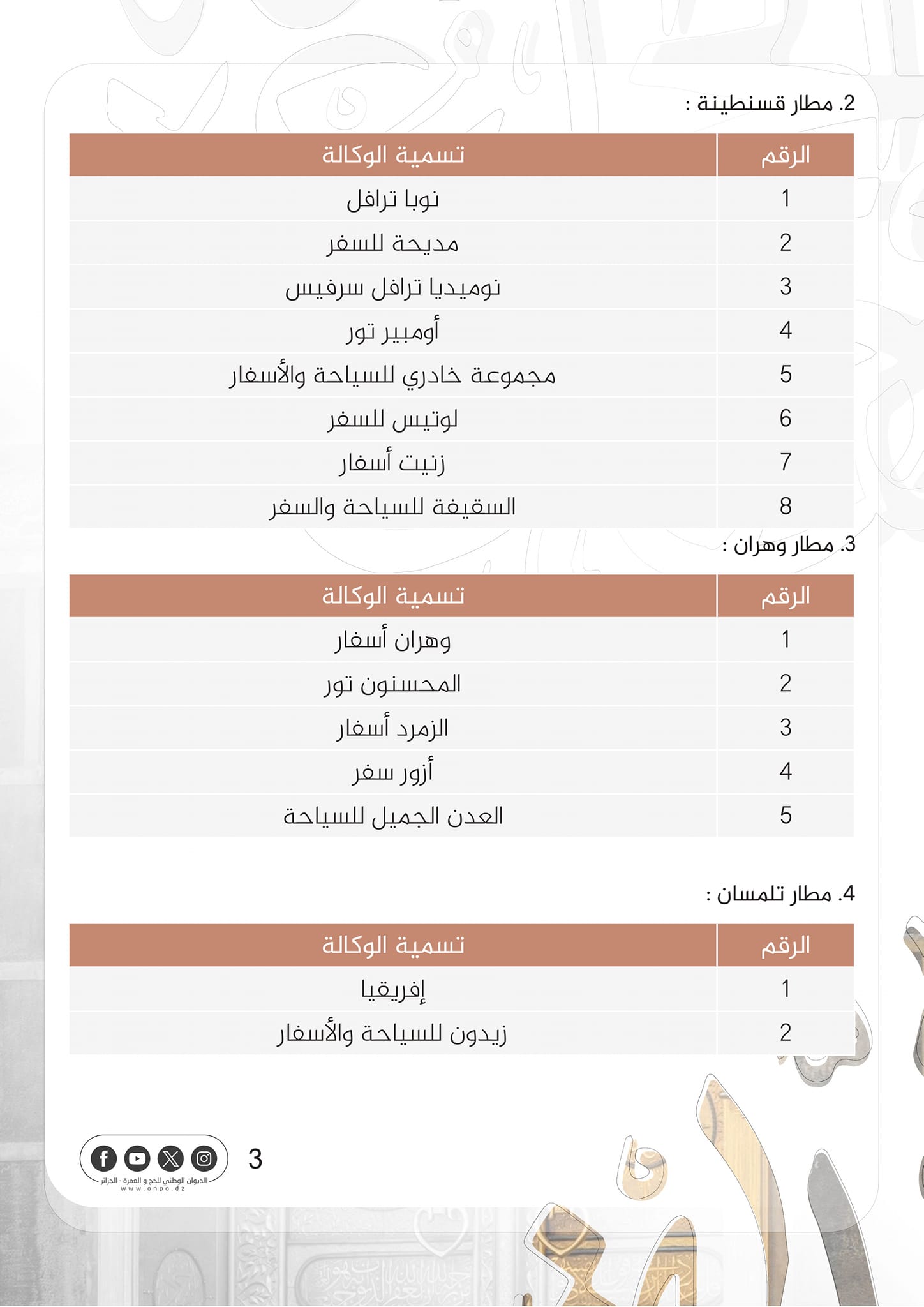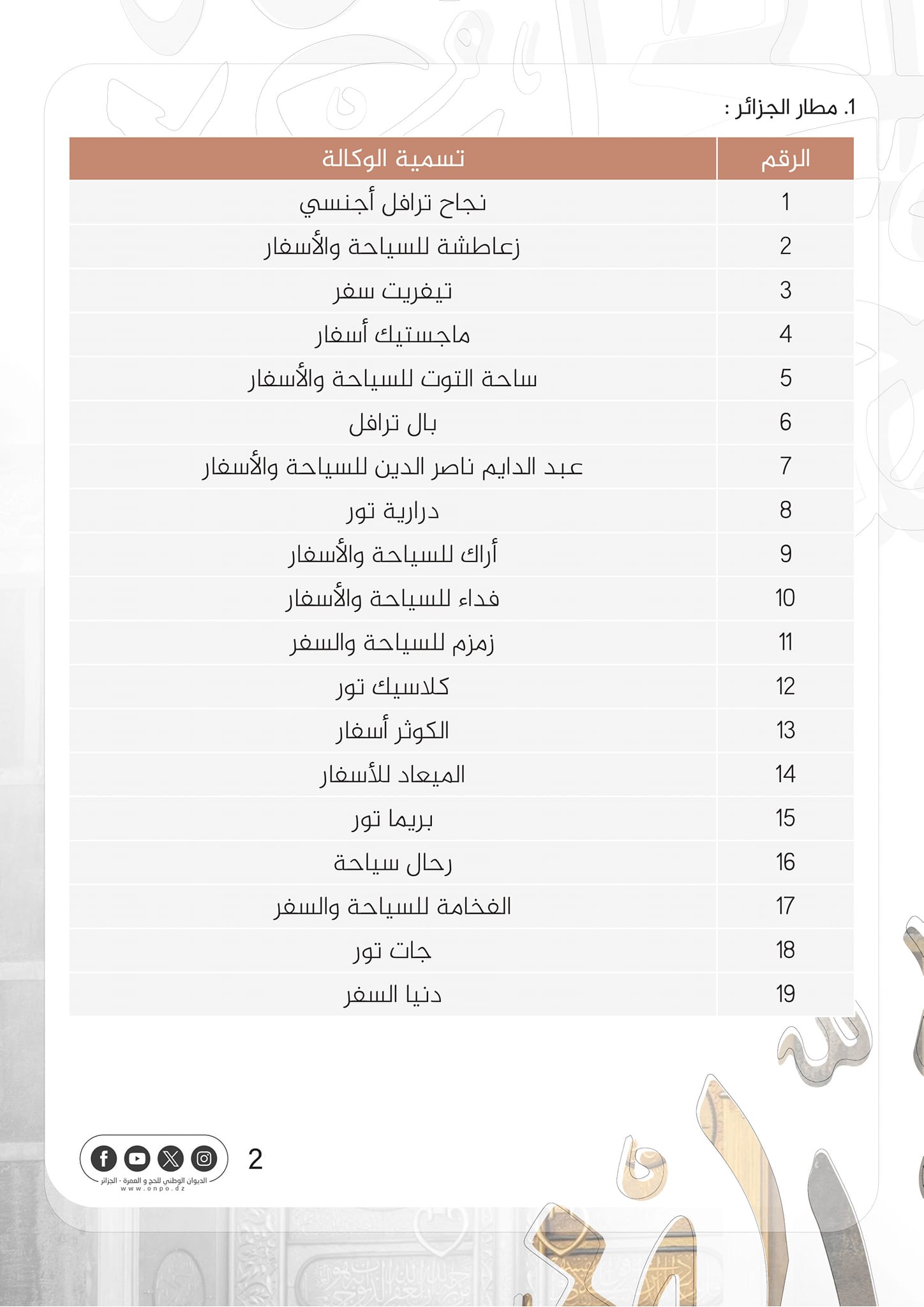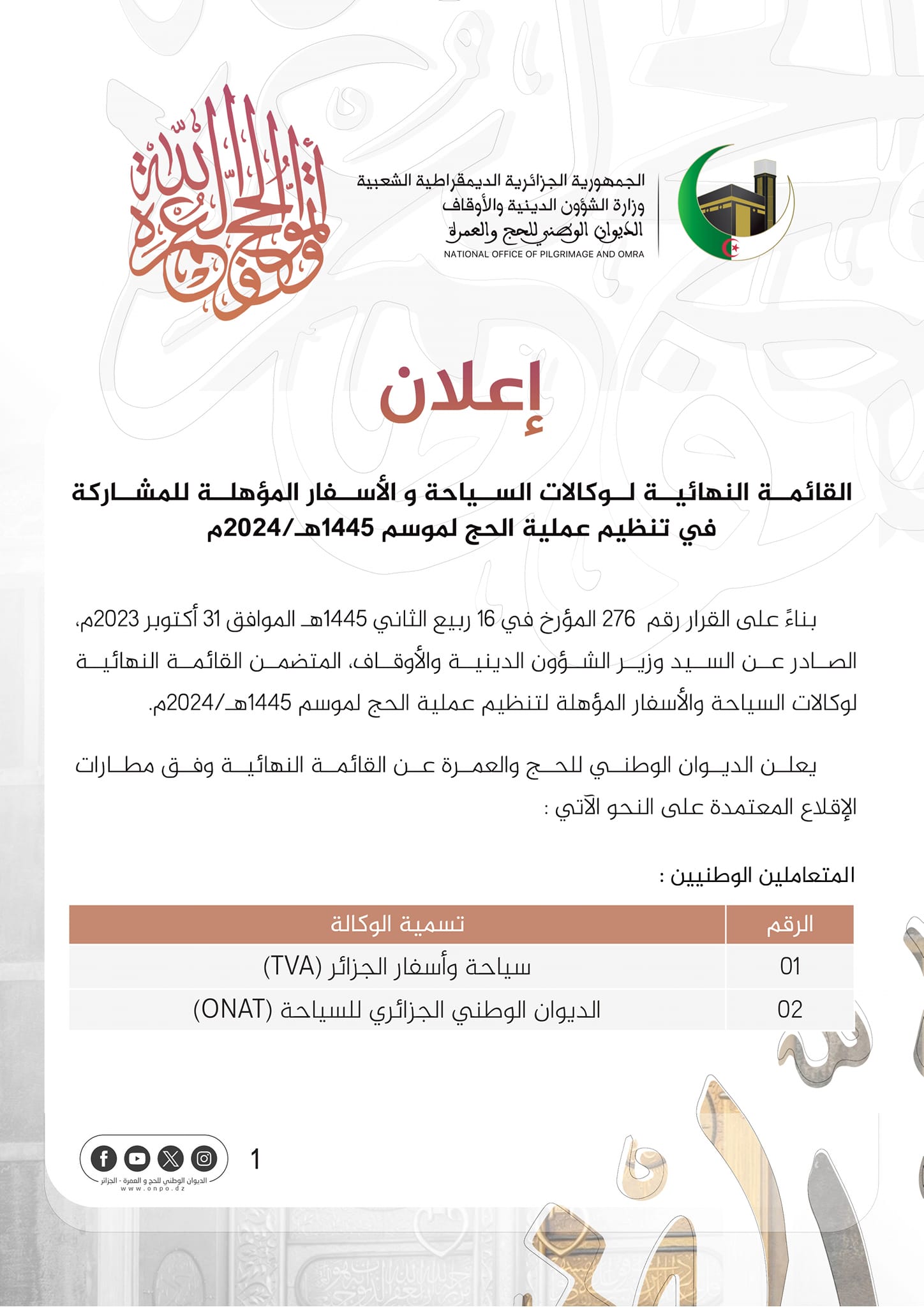 وجاء في بيان للديوان، أنه وبناء على القرار الصادر عن وزير الشؤون الدينية والأوقاف. المتضمن القائمة النهائية لوكالات السياحة والأسفار المؤهلة لتنظيم عملية الحج لموسم 1445ه/2024 م. فإن الديوان يعلن عن قائمة تضم 50 وكالة مؤهلة لتنظيم موسم الحج المقبل وفق مطارات الإقلاع المعتمدة”.