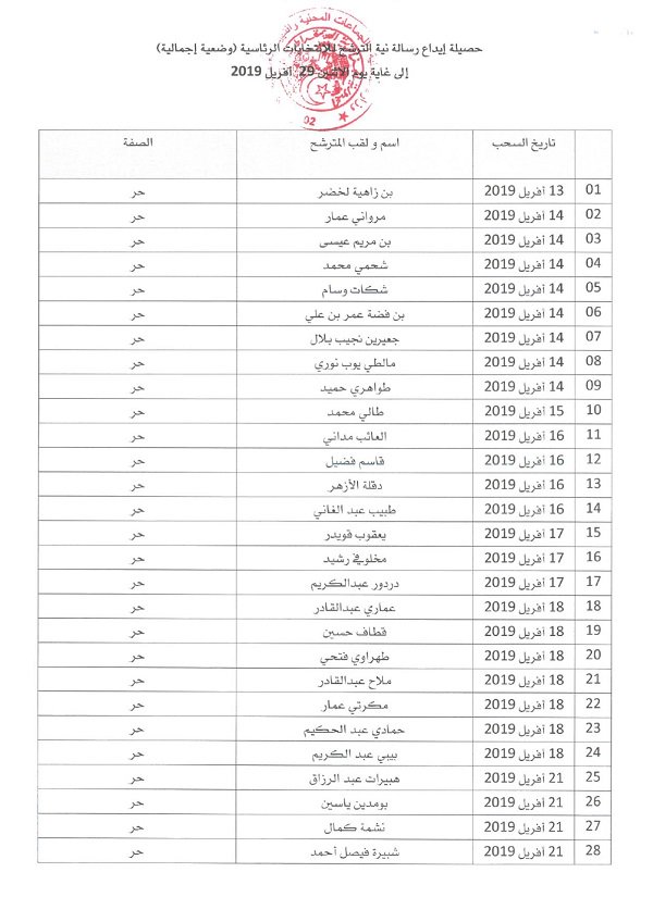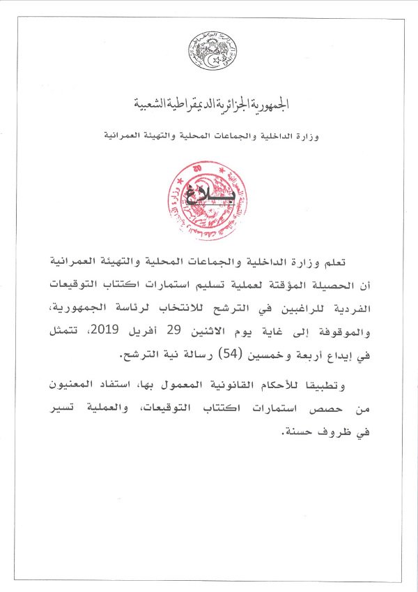 وجاء في بيان لوزارة الداخلية البيان أن “الحصيلة المؤقتة لعملية تسليم استمارات اكتتاب التوقيعات  الفردية للراغبين في الترشح للانتخاب لرئاسة الجمهورية، والموقوفة إلى غاية  يوم الاثنين 29 أفريل 2019، تتمثل في ايداع 54 رسالة نية للترشح”.