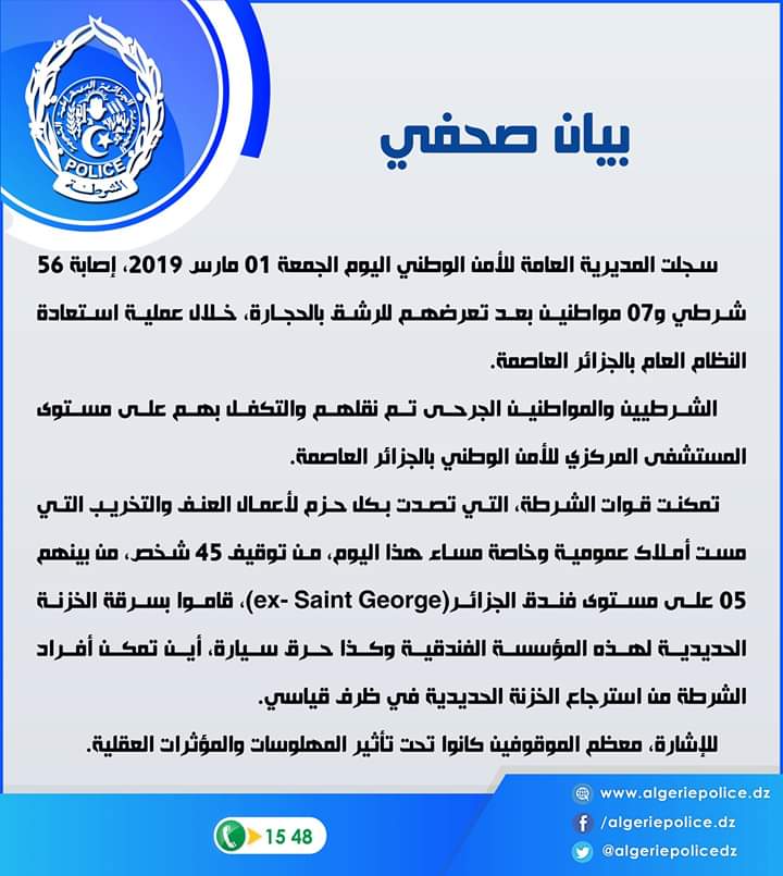 حيث سجلت المديرية وقوع 56 جريحا من أفراد الشرطة، أما بالنسبة للمدنيين أصيب 7 أشخاص مدنيين، تم إسعافهم من طرف الشرطة.