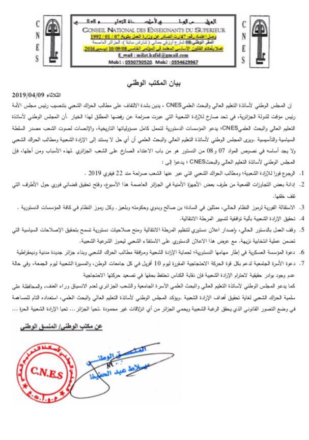 أدان المجلس الوطني لأساتذة التعليم العالي والبحث العلمي CNES، بشدة ما أسماه الإلتفاف على مطالب الحراك الشعبي.