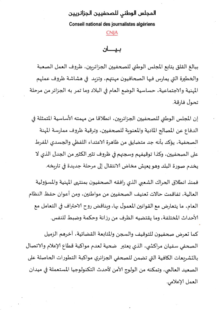 وقال البيان، إن منذ انطلاق الحراك، تفاقمت حالات تعنيف الصحفيين من مواطنين، وأعوان حفظ النظام العام،وهو ما يتعارض مع القوانين.