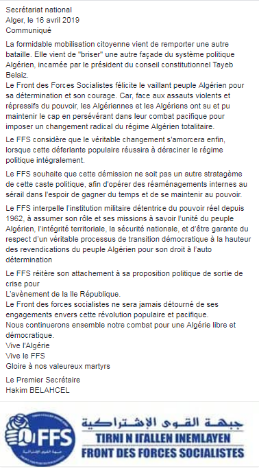 وقال حزب الـFFS إن التعبئة الهائلة للشعب الجزائري، قد كسرت واجهة أخرى من واجهات النظام التي يجسدها رئيس المجلس الدستوري.