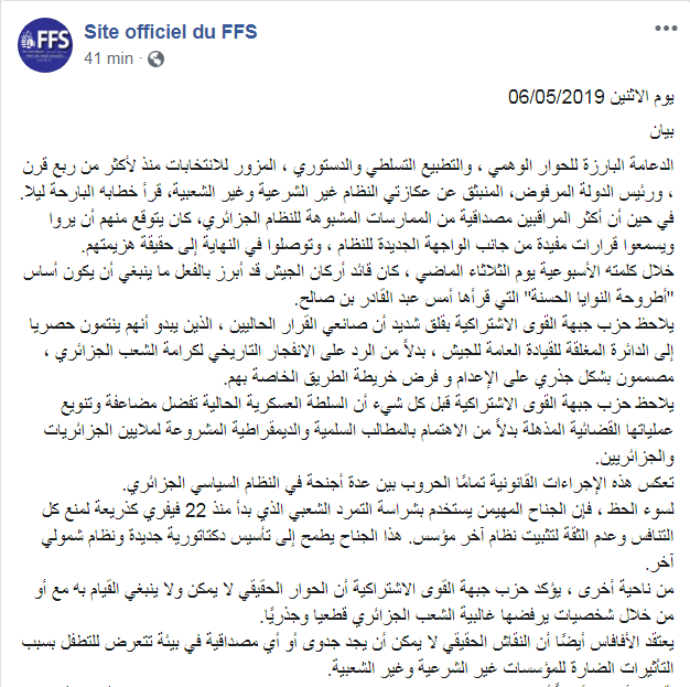 وردا على الخطاب الذي وجهه رئيس الدولة عبد القادر بن صالح أمس للجزائريين، أكد الـFFS بأن الحوار الحقيقي لا يكون