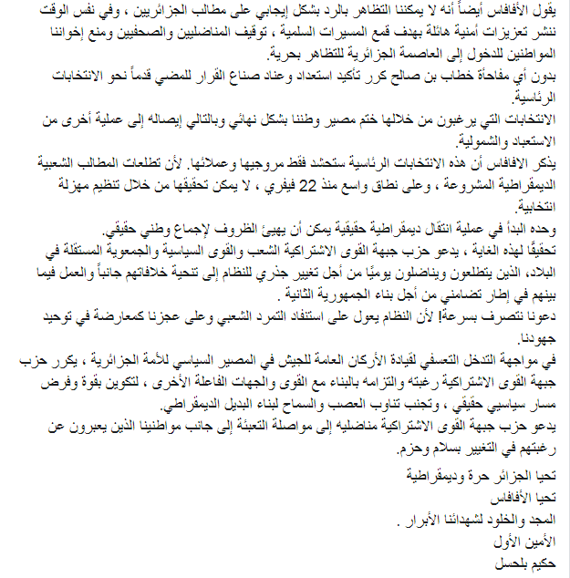 وقال حزب الأفافاس، إن الإنتخابات الرئاسية الحالية في حال تم تنظيمها، ستحشد فقط الموالون للسلطة الحالية على حساب إرادة الشعب.