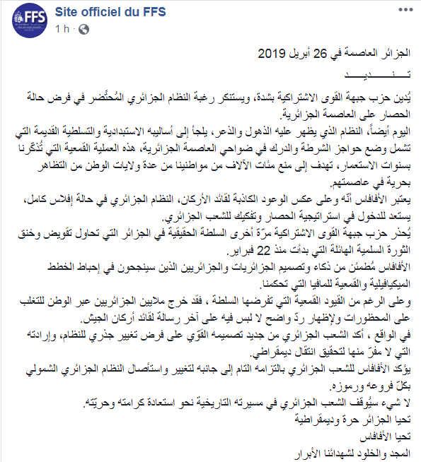 أدان حزب جبهة القوى الإشتراكية FFS بشدة، رغبة النظام المُحتضر كما وصفه في فرض حالة الحصار على العاصمة الجزائرية.