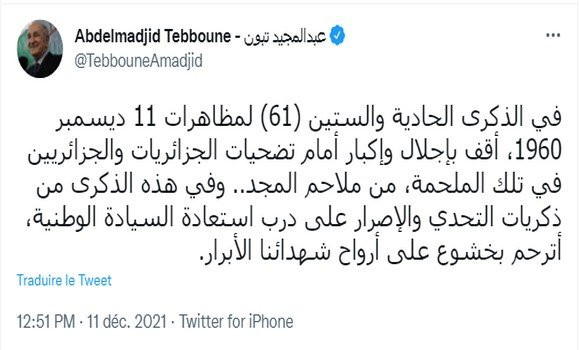 Algérie - Le président de la République, Abdelmadjid Tebboune a affirmé samedi à l’occasion du 61e anniversaire des manifestations du 11 décembre 1960, “s’incliner avec respect devant les sacrifices des Algériennes et Algériens” lors de ces évènements, les qualifiant d”’épopée parmi les plus glorieuses“.