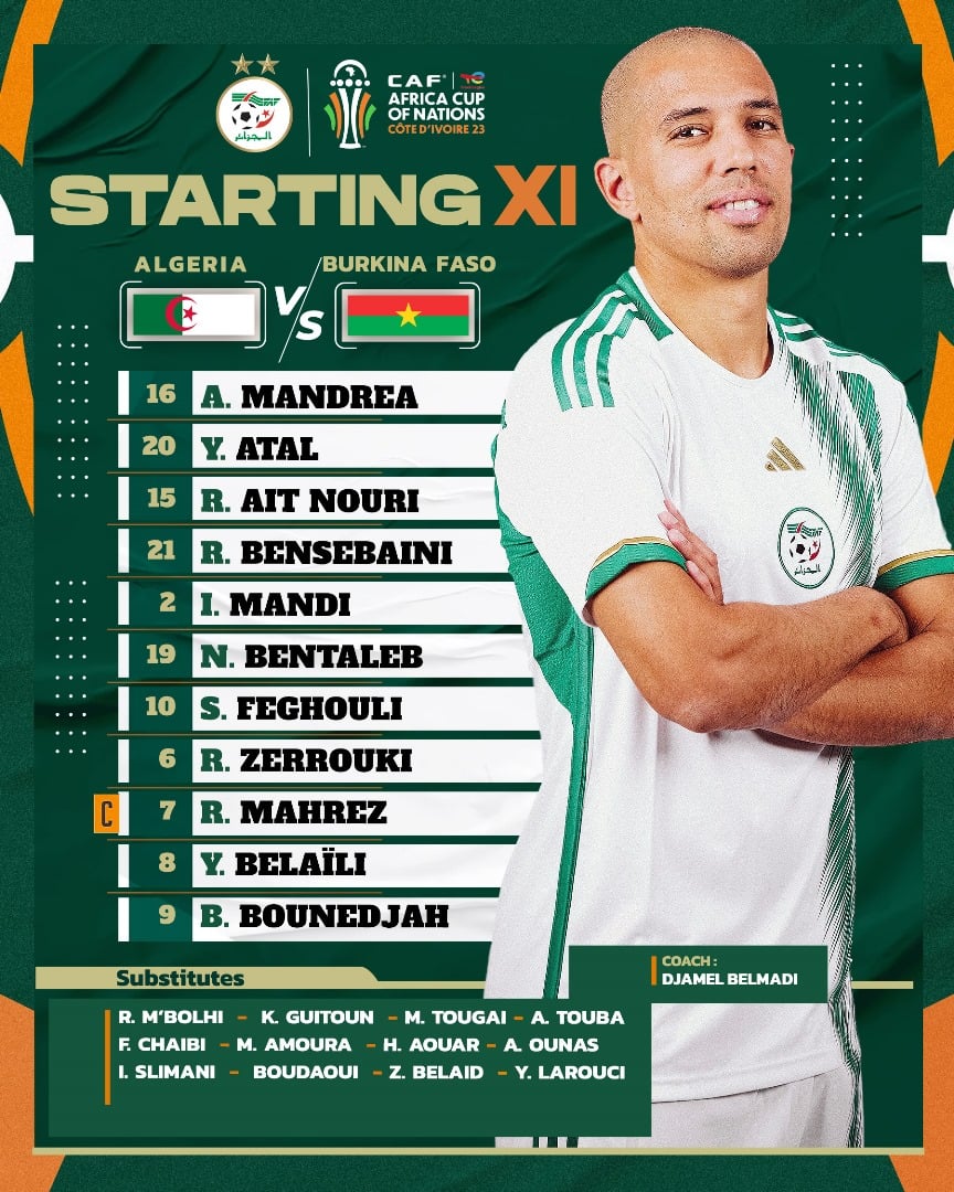 Le sélectionneur national, Djamel Belmadi, a dévoilé la composition officielle choisie pour affronter ce samedi le Burkina Faso dans le cadre de la 2ème journée du groupe D de la CAN TotalEnergies.