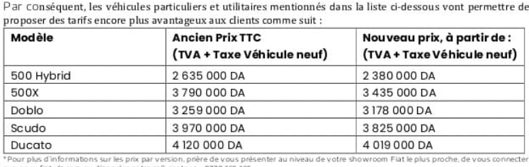 Le concessionnaire de la marque Fiat en Algérie a annoncé, dans un communiqué publié ce dimanche, des réductions de prix qui toucheront ses véhicules de tourisme et utilitaires.