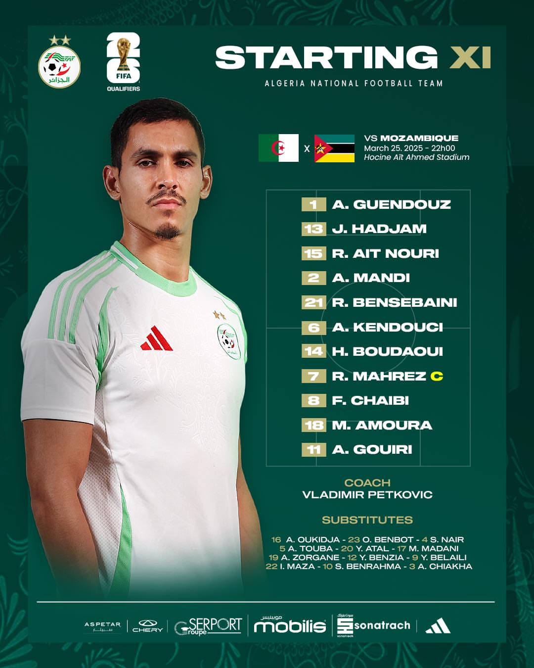 L’Algérie affronte le Mozambique, ce mardi soir, dans le cadre de la sixième journée des éliminatoires de la Coupe du Monde 2026. L’équipe choisie par le sélectionneur, Vladimir Petkovic, a été dévoilée.