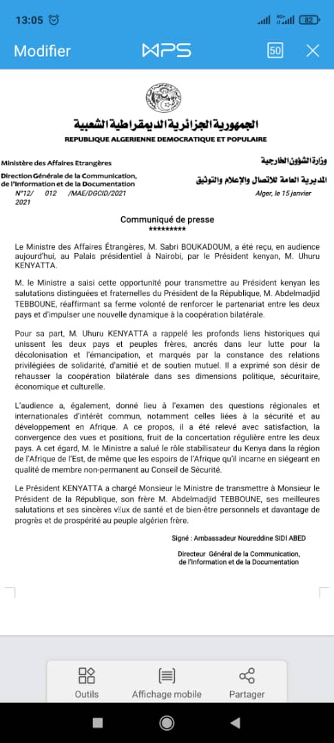 Saisissant cette occasion, Boukadoum a transmis au président Kenyan ” les salutations distinguées et fraternelles du président de la République Abdelmadjid Tebboune”, réaffiramant sa ferme volonté de renforcer le partenariat entre les deux pays et d’impulser une nouvelle dynamique à la coopération bilatérale.