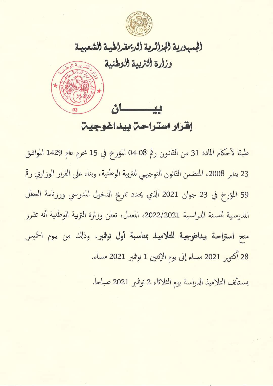 À l’occasion du 1 novembre, “il s’est décidé l’octroi d’un repos pédagogique de quatre jours aux élèves. Il s’étalera de l’après-midi du jeudi 28 octobre 2021 au 1er lundi novembre. Lit-on, ainsi, dans le communiqué du ministère.