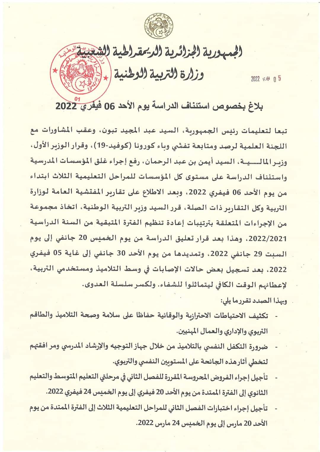 Algérie - Après plus de deux semaines de repos imposé par la forte propagation des contaminations de Covid-19, notamment, dans les établissements scolaires qui rouvrent dès demain 6 février 2022 leur portes aux élèves.