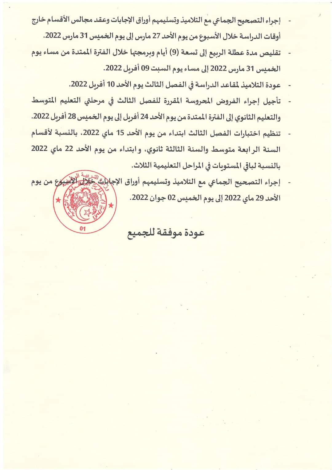 9. Les examens du troisième semestre à partir du dimanche 15 mai, pour les classes de quatrième année moyenne et de troisième année secondaire, et à partir de dimanche 22 mai 2022 pour le reste des niveaux des trois cycles de l’enseignement.