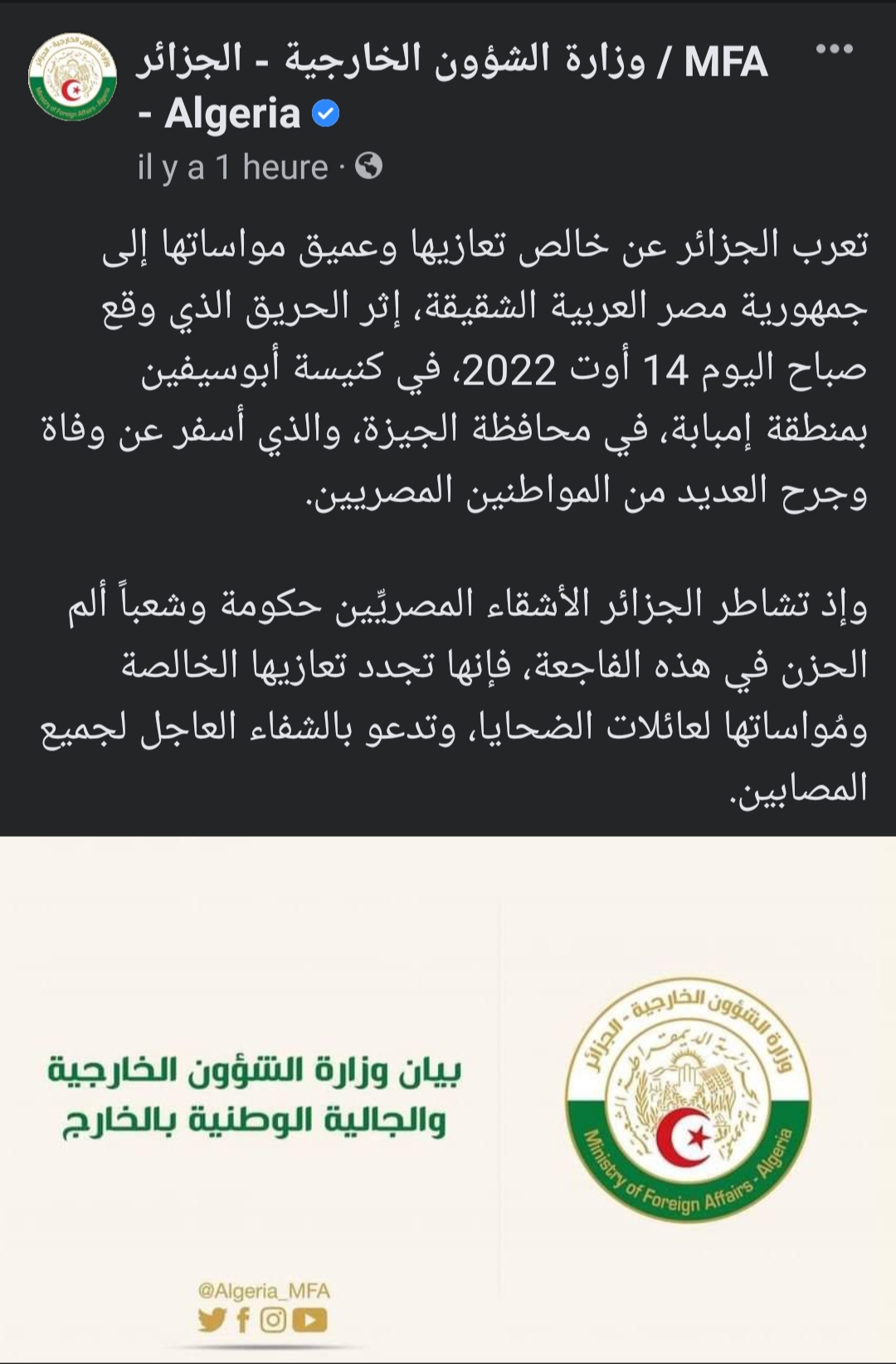 “L’Algérie exprime ses sincères condoléances et sa profonde compassion à la République arabe d’Egypte, pays frère, suite à l’incendie qui s’est déclaré, dimanche matin, dans l’église Abou Sifine située à Imbaba dans le gouvernorat de Gizeh, faisant plusieurs décès et blessés parmi les citoyens égyptiens”. Peut-on, notamment, lire dans le communiqué du MAE.