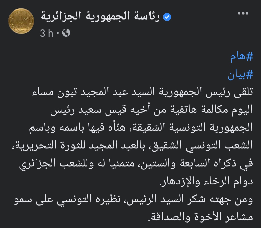 Algérie - Le président de la République tunisienne, Kaïs Saïed n’a pas manqué l’occasion du 67e anniversaire du déclenchement de la guerre de libération algérienne pour souhaiter à son homologue le président de la République Abdelmadjid Tebboune ses meilleurs vœux.