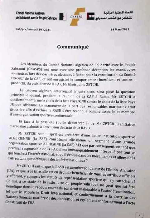 Algérie - Le Comité national algérien de solidarité avec le peuple sahraoui (CNASPS) a noté lundi avec une “profonde déception” les “manœuvres sournoises” déniant aux Sahraouis le droit à une représentation sportive continentale, lors de l’assemblée générale (AG) de la Confédération africaine de football (CAF), tenue vendredi à Rabat.