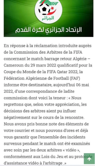La FAF, a annoncé sur son site officiel, un communiqué confirmant qu’elle avait reçu une correspondance officielle de la commission d’arbitrage de la FIFA. “Nous regrettons que, selon votre appréciation, les décisions des arbitres aient pu influer négativement sur le cours de la rencontre. Nous avons pris bonne note des éléments de votre courrier et nous pouvons d’ores et déjà vous garantir que l’ensemble des incidents survenus pendant le match ont été examinés avec soin par les deux arbitres « vidéo », conformément aux Lois du Jeu et au protocole d’assistance vidéo à l’arbitrage“, précise la FAF dans son communiqué.