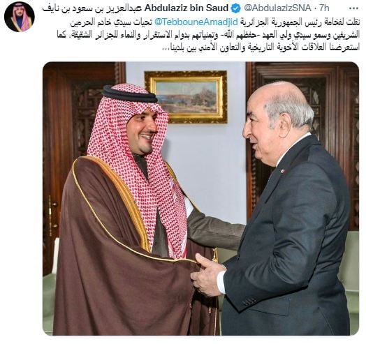 «J’ai transmis à Son Excellence le président de la République d’Algérie, Abdelmadjid Tebboune, les salutations du Serviteur des Deux Saintes Mosquées et de Son Altesse le Prince Héritier -Qu’Allah les protège-; ainsi que leurs vœux de stabilité et de développement continus pour l’Algérie». Lit-on, ainsi, sur son compte officiel sur Twitter.
