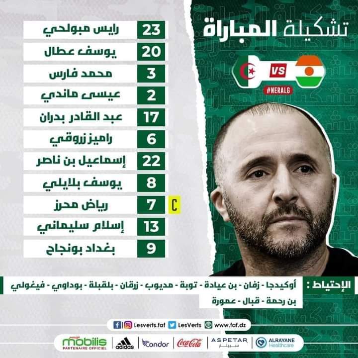 Algérie - Pour le cette rencontre de la 4e journée des qualifications pour le Mondial qatri opposant le Niger face à l’Algérie ce mardi (17h00), Belmadi a décidé de titulariser la même équipe qui s’est imposée à Tchaker (6-1), à une seule exception.