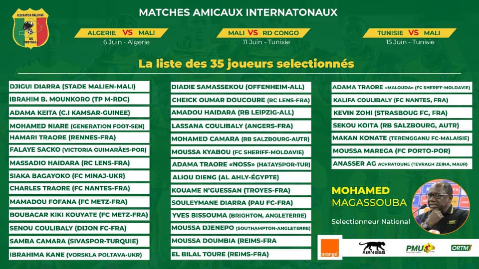 Algérie - Alors que le sélectionneur malien a convoqué 35 joueurs pour les matchs amicaux prévu ce mois, dont leur premier test contre l’Algérie, ils ne seront que 26 éléments présents. 09 joueurs ont en effet déclaré forfait pour diverses raisons…
