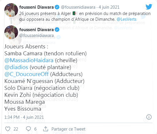 L’information a, d’ailleurs, été annoncé et confirmé, hier, par le team manager des Aigles du Mali, Fousseni Diawara, sur Twitter. Ce dernier, a précisé que “Samba Camara, Massadio Haidara, Diadie Samassekou, Cheick Doucouré et Rominigue Kouamé sont blessés”. En fin de contrat dans leurs clubs respectifs, Solo Diarra et Kevin Zohi ont préféré régler assurer leur avenir en club. En revanche, l’absence la plus évidente du groupe malien est celle des deux attaquants: Moussa Marega (fC Porto) et Yves Bissoum (Brighton) qui ne répondent, pas à l’appel pour des raisons assez floue !