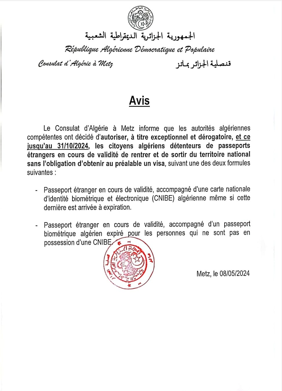 Dans un avis publié par le consulat général d’Algérie à Metz, il est indiqué que les Algériens, détenteurs d’un passeport étrangers, peuvent « entrer » et « sortir » du territoire national sans l’obligation d’obtenir « au préalable un visa ».