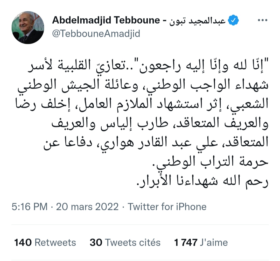 «A Allah nous appartenons et à Lui nous retournons. Mes sincères condoléances aux familles des martyrs du devoir national et à la famille de l’ANP, suite au décès du sous-lieutenant de carrière Ikhlef Rédha; et des caporaux contractuels Tareb Ilyes; et Ali Abdelkader Houari, morts en martyrs en défendant l’intégrité du territoire national. Paix à l’âme de nos valeureux Chouhada”. Pouvait-on notamment lire dans le message de condoléances du président de la République sur son compte Twitter.
