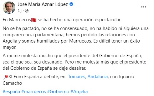 José María Aznar, président du gouvernement espagnol de 1996 à 2004, a vertement critiqué Pedro Sánchez, l’actuel président du gouvernement, pour son tropisme pro-marocain. Il a également fustigé les résultats de sa dernière visite à Rabat.