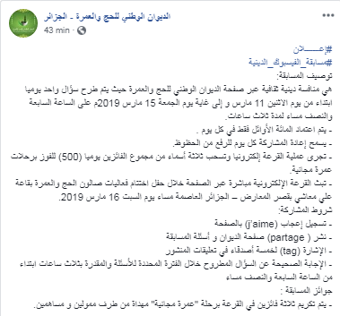 اشترط الديوان الوطني للحج والعمرة للفوز برحلات العمرة، في إطار مسابقة صالون الحج، الإعجاب بصفحته على الفايسبوك.