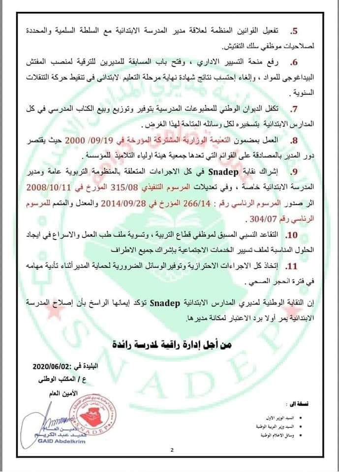 كما طالبت النقابة أيضا بإلحاق تسيير المدرسة الابتدائية بوزارة التربية وفصلها عن البلدية في أقرب وقت ممكن وتزويدها بميزانية تسيير مستقلة، بالإضافة الى مطالب اخرى.