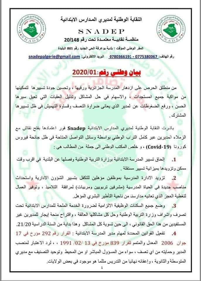 خلص المكتب الوطني جملة من المطالب أبرزها وضع جميع السكنات الوظيفية الالزامية لضرورة الخدمة الملحة للمدارس الابتدائية تحت تصرف وإشراف وزارة التربية الوطنية وحل كل مشاكلها العالقة واقتراح منحة ايجار للمدبرين غير المستفيدين من هذا الحق القانوني إلى حين تسوية كل المشاكل وهذا بداية من السنة الدراسية 2020-2021.