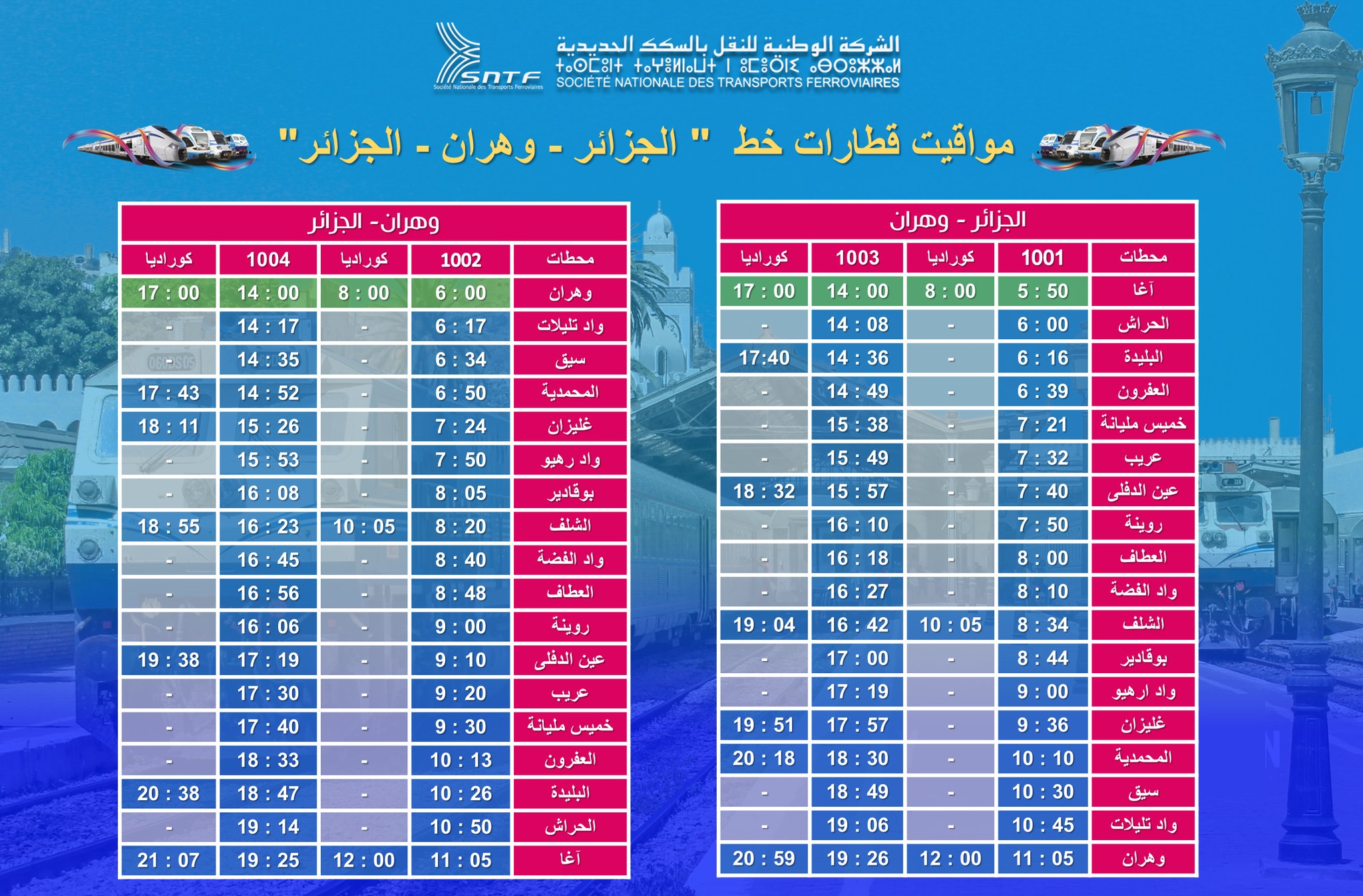 أعلنت الشركة الوطنية للنقل بالسكك الحديدية، اليوم الإثنين، عن البرنامج اليومي لمواقيت سير القطارات على خط (الجزائر - وهران – الجزائر).