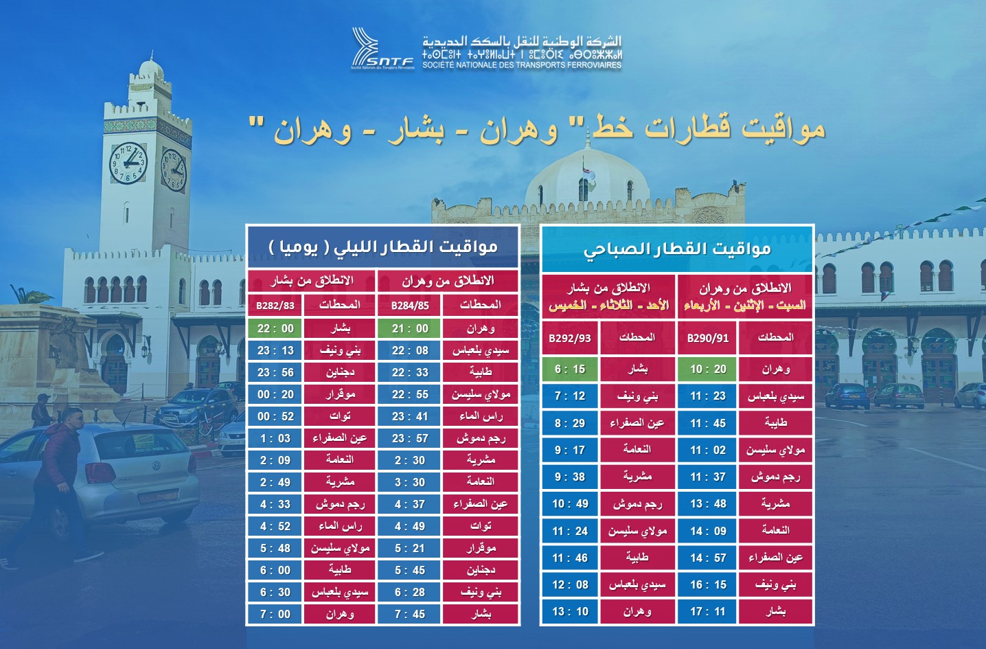 نشرت المؤسسة الوطنية للنقل بالسكك الحديدية، مواقيت سير قطار خط وهران-بشار-وهران، الذي يربط ولايتي وهران وبشار عبر عشر محطات.