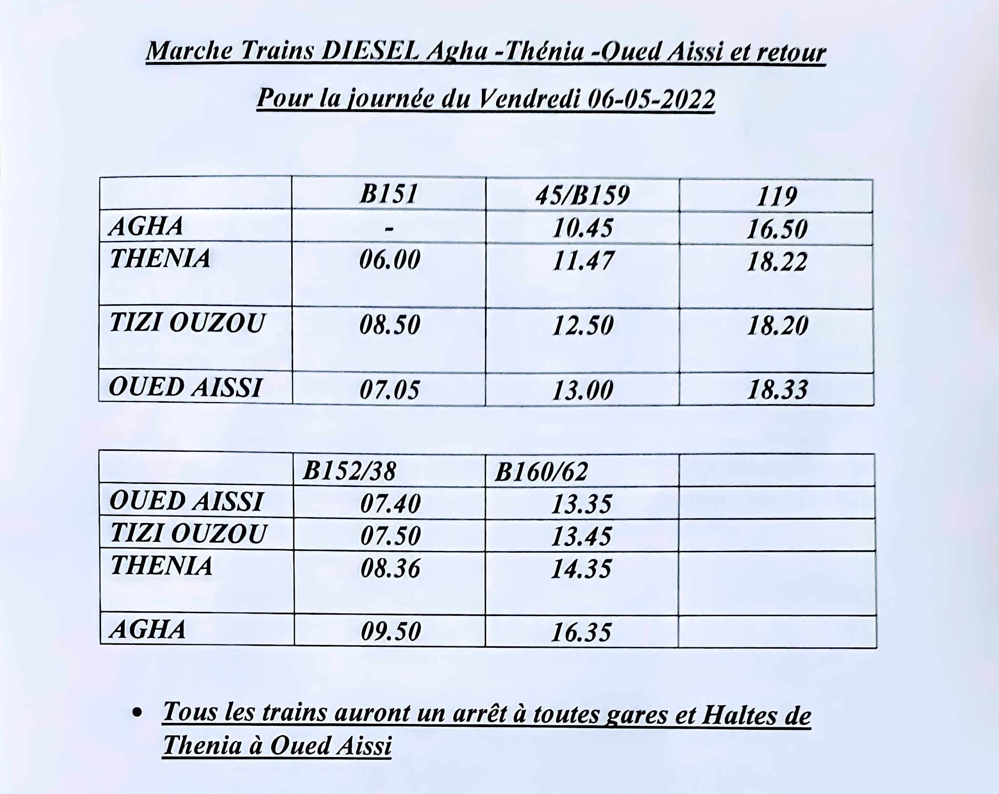 أما باقي الرحلات على خطي الجزائر - الثنية / الجزائر – تيزي وزو ستسير عبر قطارات ديزل حسب الجدول المبين أدناه.