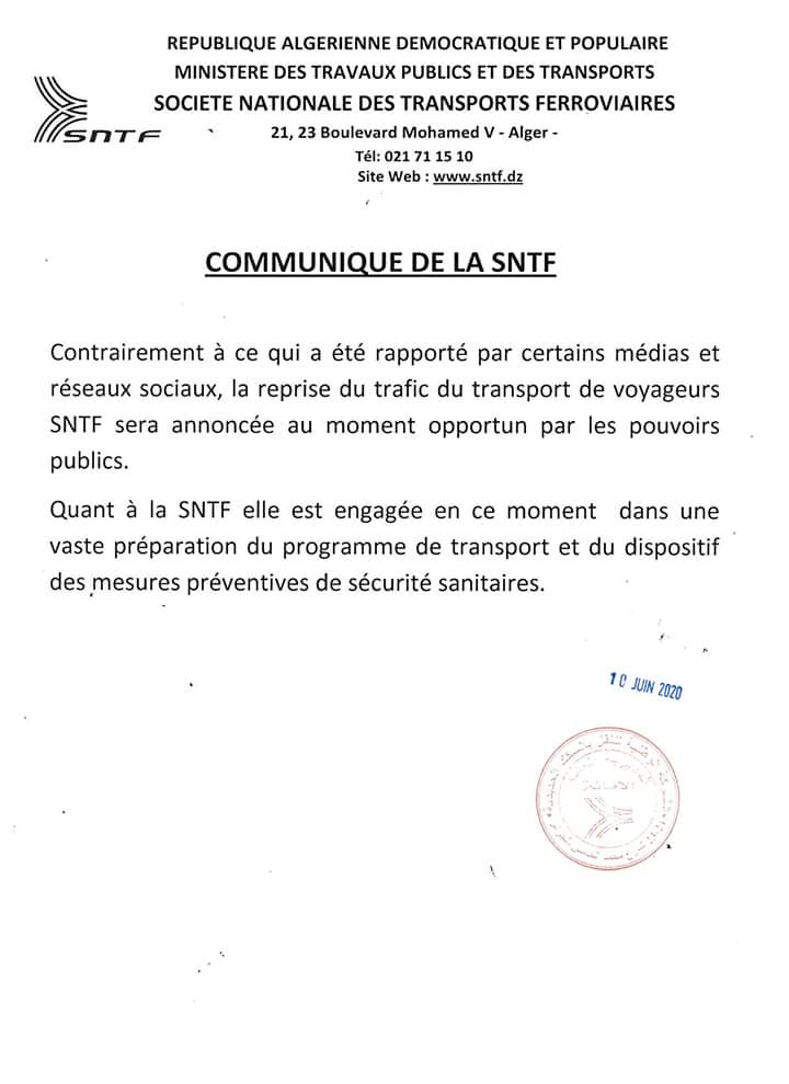 أفادت الشركة الوطنية للنقل بالسكك الحديدية (SNTF) في بيان يوم الأربعاء إن السلطات العمومية ستعلن استئناف حركة نقل الركاب في الوقت المناسب.