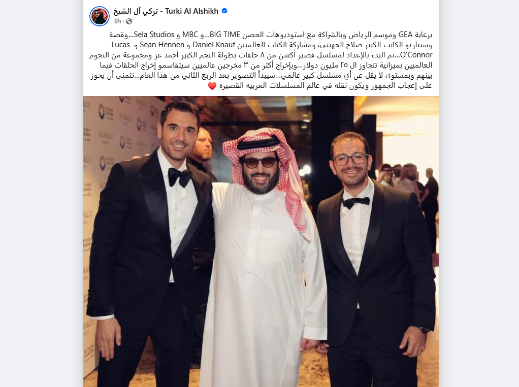 وكشف آل الشيخ، أن المسلسل يُنْتَج تحت رعاية “موسم الرياض”، وبشراكة مع استوديوهات الحصن، وصندوق BIG TIM، وMBC، وSela Studios.